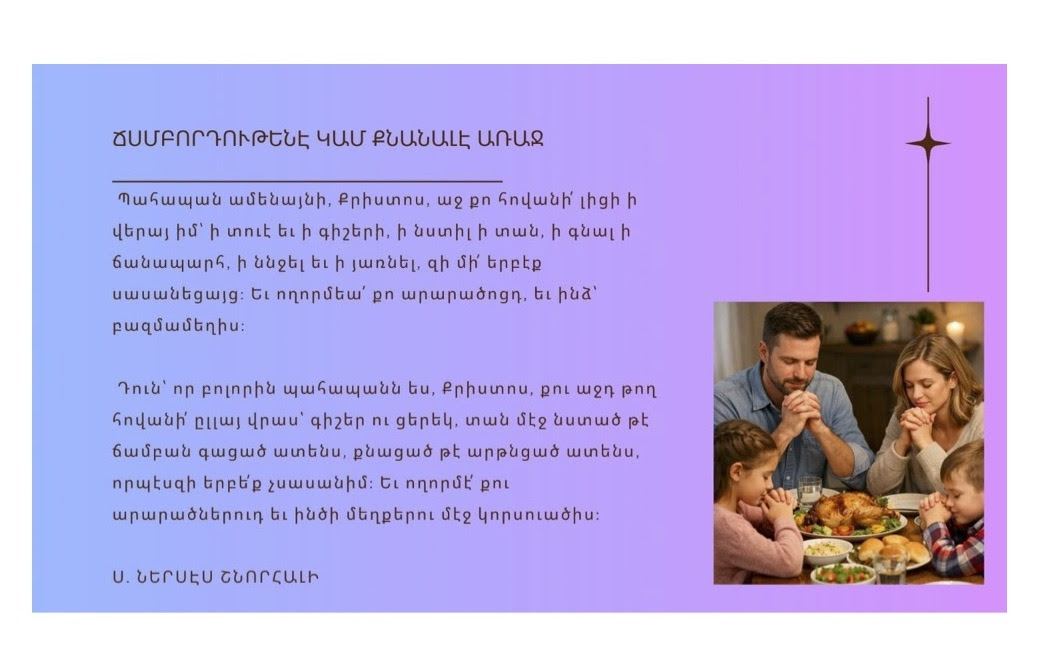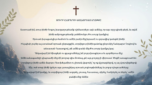 Յաւիտեաններու Աստուածը եւ բոլորին ստեղծիչը որ Քու ամենակարող զօրութեամբ սկիզբէն երկինքն ու երկիրը ստեղծեցիր, Քու հրամանովդ լոյսը ստեղծեցիր եւ լոյսը խաւարէն բաժնեցիր (Ծննդոց 1:3-4)։ Ահա … Read more