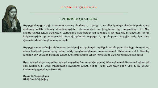 Տէր Ամենակալ և ողորմած Աստուած, Շնորհակալ եմ, որ այս նոր օրը պարգեւեցիր ինծի։ Լուսաւորէ իմ միտքս, մաքրէ իմ սիրտս, որ այս օրը ապրիլ կարողանամ քու սուրբ կամքովդ։ Ուղղէ իմ … Read more