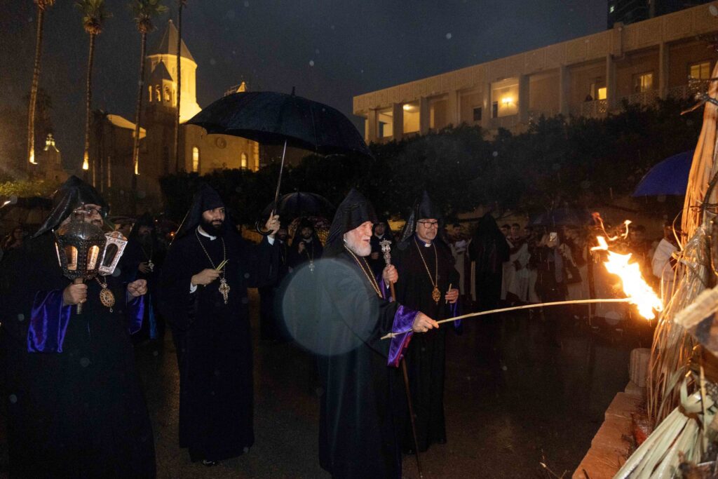 Եկեղեցական հոգեպարար արարողութեանց աւարտին, հակառակ տեղատարափ անձրեւին, հաւատացեալներ, իրենց Հովուապետին գլխաւորած թափօրով, ուղղուեցան եկեղեցւոյ շրջափակ, ուր Հայրապետին ձեռամբ տեղի ունեցաւ աւանդական հրավառութիւնը։ Խարոյկին շուրջ Դպրեվանքի աշակերտները երգեցին հոգեւոր ու հայրենասիրական երգեր: